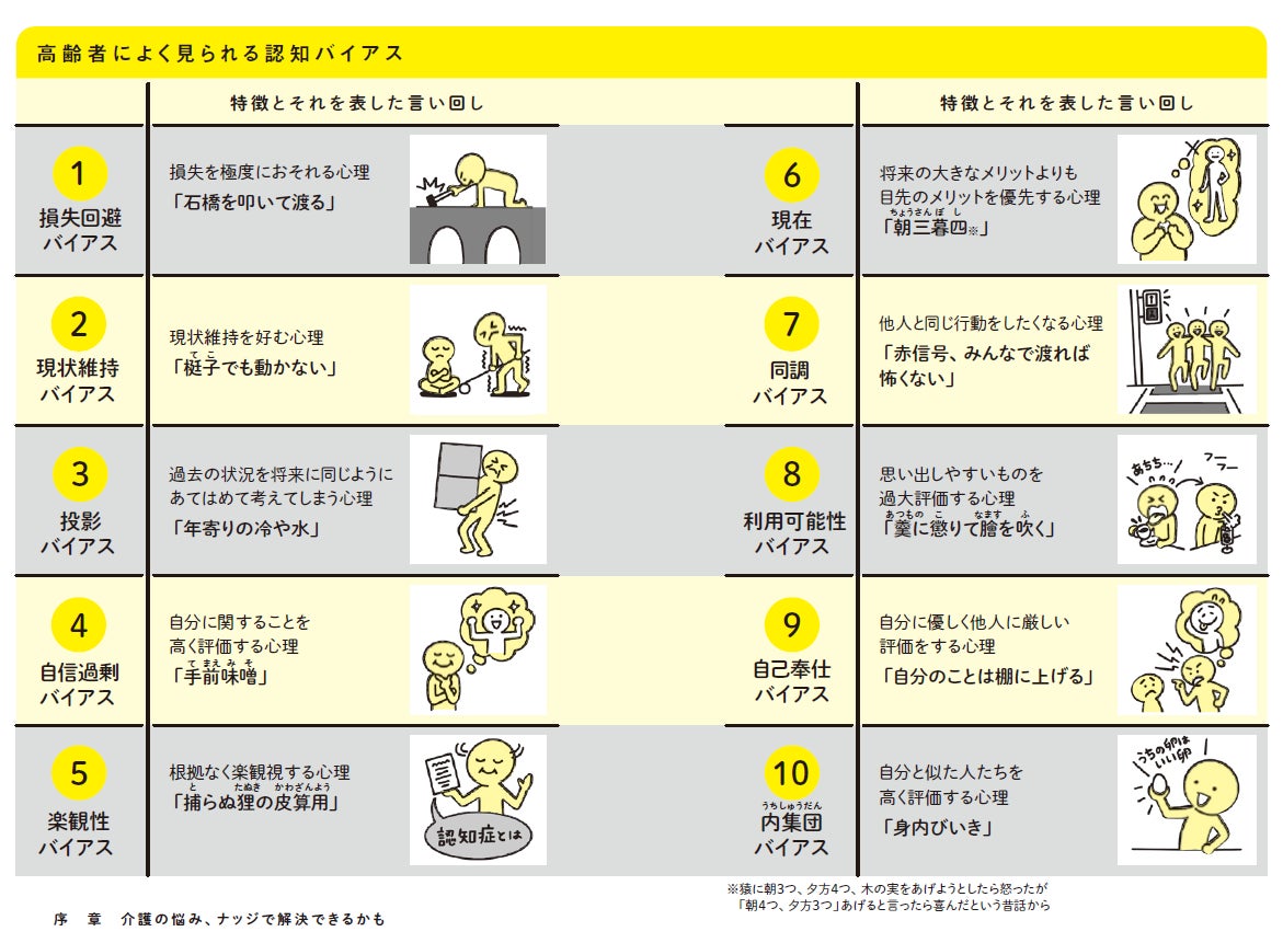 本書では、8家族の事例を紹介し、それぞれの親が持つ「わかってはいるけど、できない心理(高齢者によく見られる認知バイアス)」が親子のすれ違いに関係していると解説しています。この「認知バイアス」に対して、著者3名が自らの家族介護経験と専門知識、そして「ナッジ」を用いて解説しています。